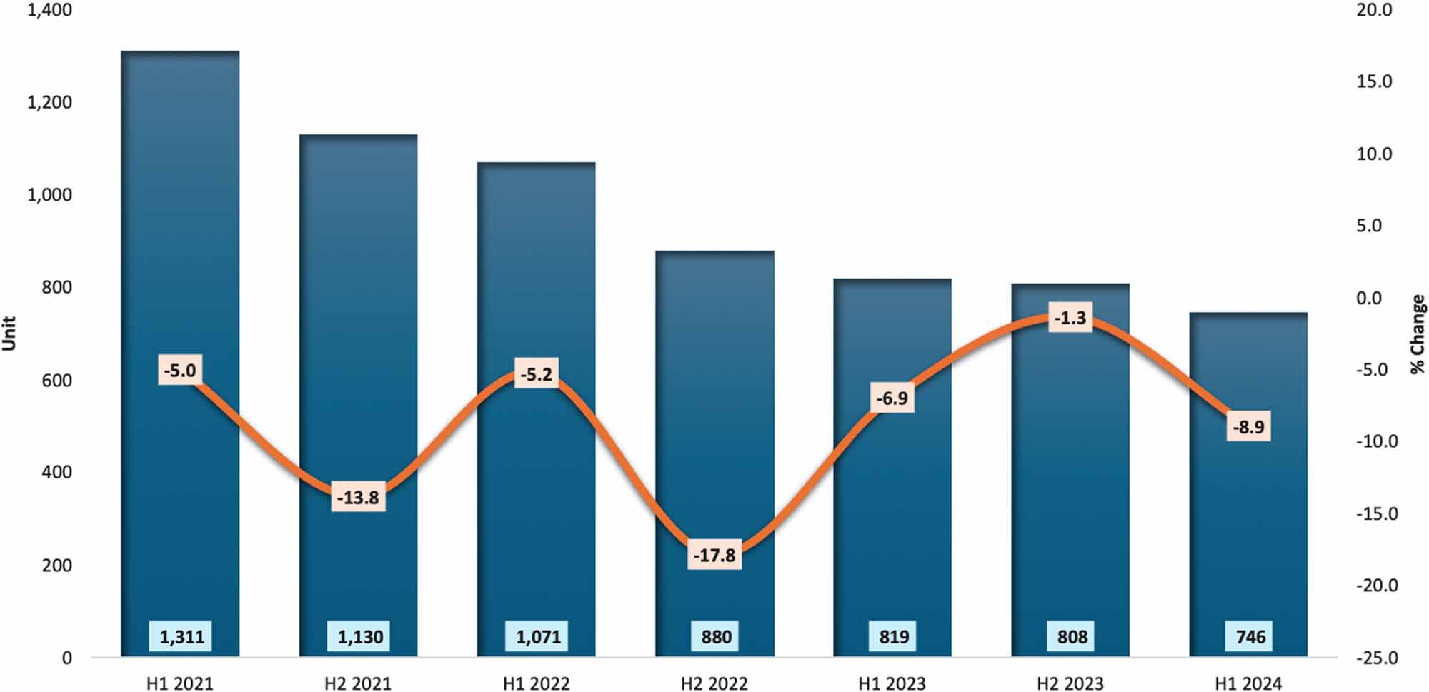The overhang situation for the industrial subsector continued to improve in the first half of 2024. A total of 746 overhang units, valued at RM0.78 billion, was recorded, reflecting a decrease of 7.7% in terms of quantity and 20.8% in terms of value compared to the previous half-year. A decrease of 8.9% was also observed during the same period in 2023, amounting to 819 units in the first half of 2023.