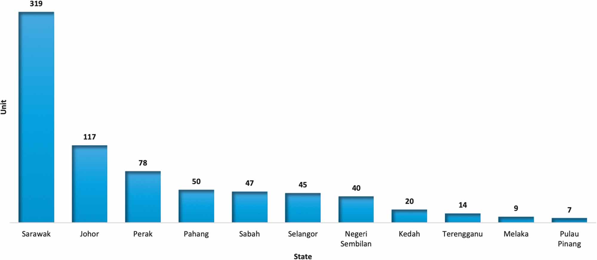 Sarawak holds the highest number of overhang of industrial properties, totalling 319 units (42.8%) valued at RM215.6 million, followed by Johor with 117 units valued at RM163.7 million.