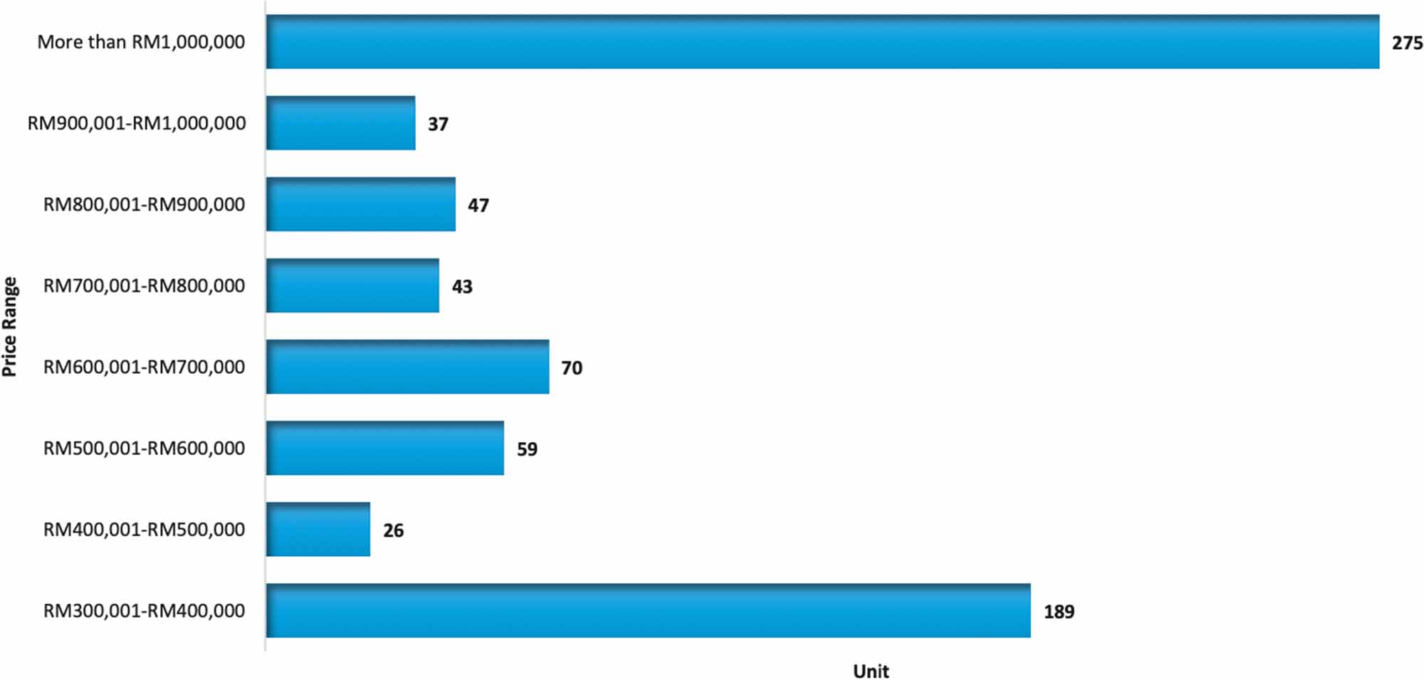 More than half of the terrace-type industrial units dominate the record of overhang, accounting for 60.5% (451 units). The majority of the overhang industrial units consist of those priced above RM1 million, which represents 36.9% (275 units).