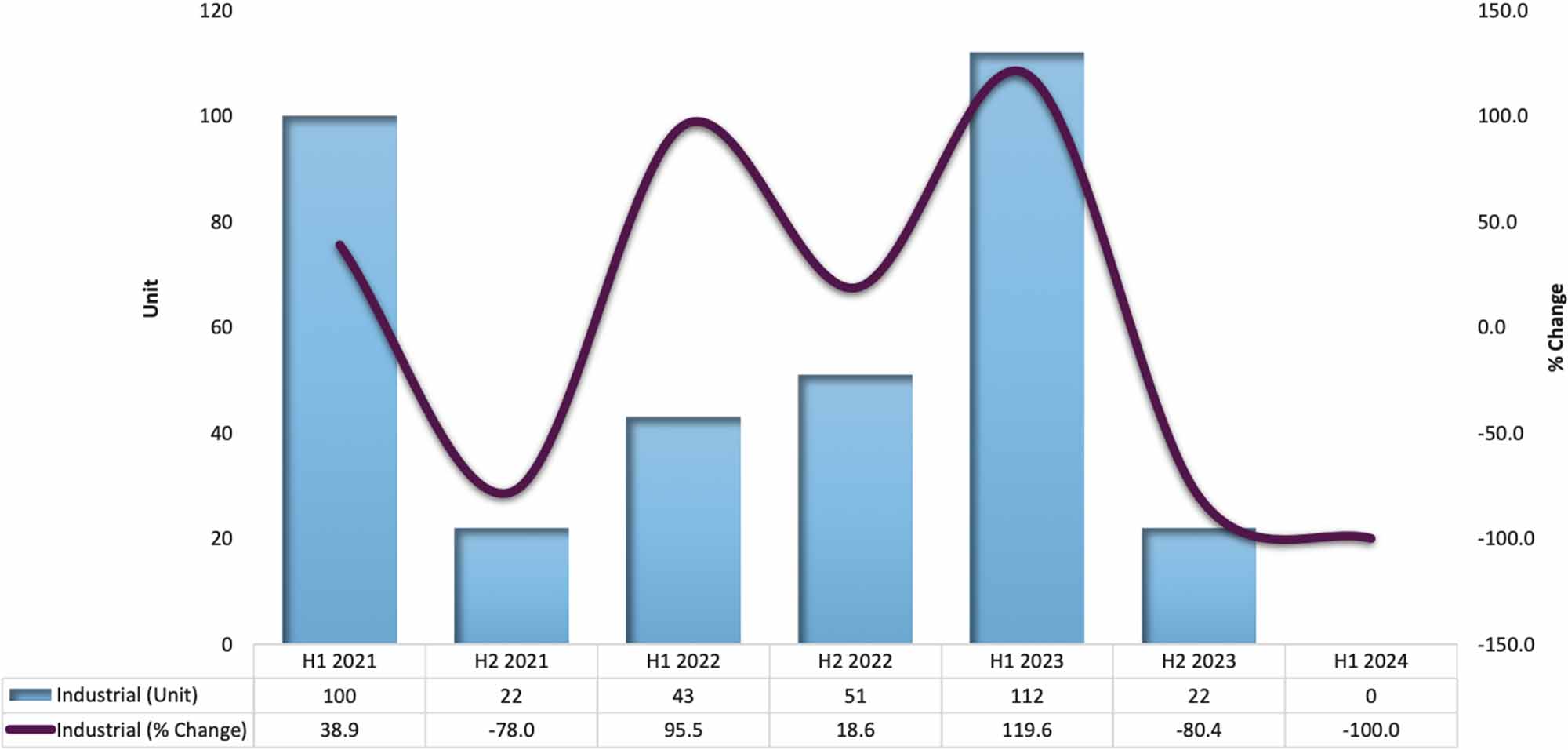 No unsold not constructed units for industrial property recorded in the first half of 2024, compared to 112 units recorded in the first half of 2023.